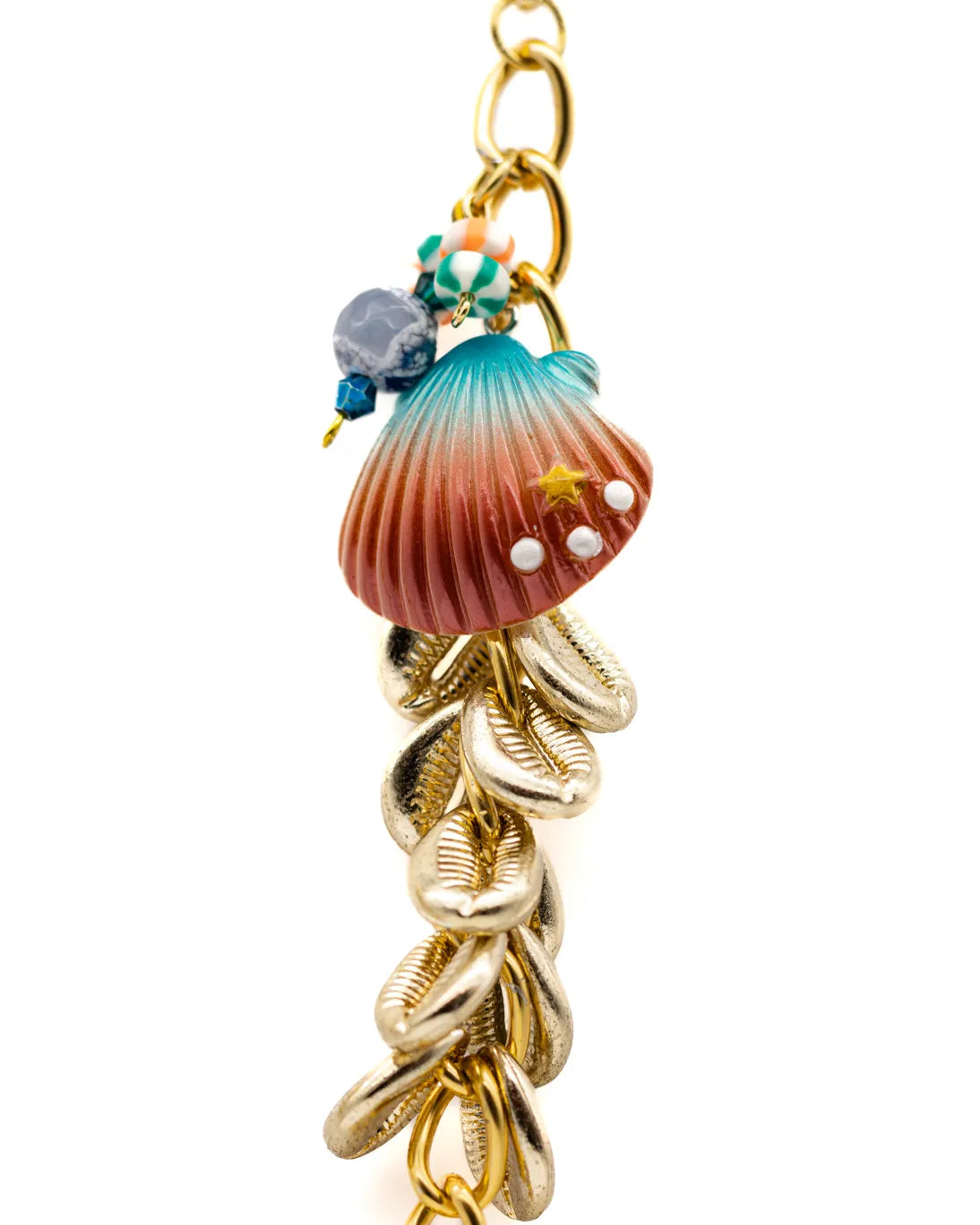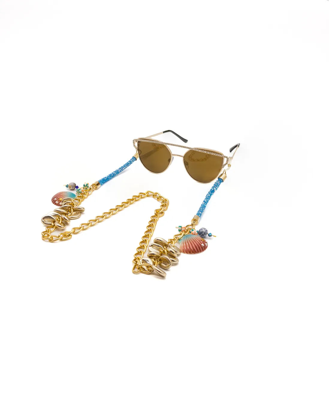 Each eyewear chain is skillfully adorned with natural scallop shells and glistening blue rods, reminiscent of the captivating allure of the seaside. These dazzling adornments catch the light from every angle, creating a glittering spectacle that is sure to turn heads. Let the shimmering blues and natural hues transport you to tranquil beachside memories, bringing a touch of summer to your daily ensemble.