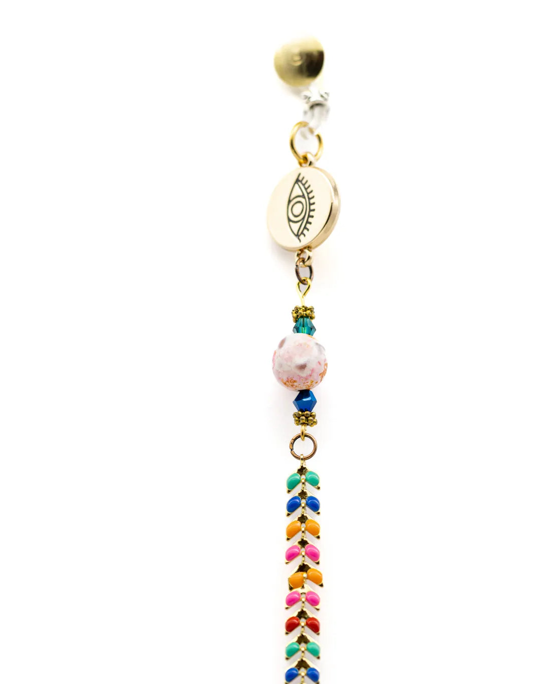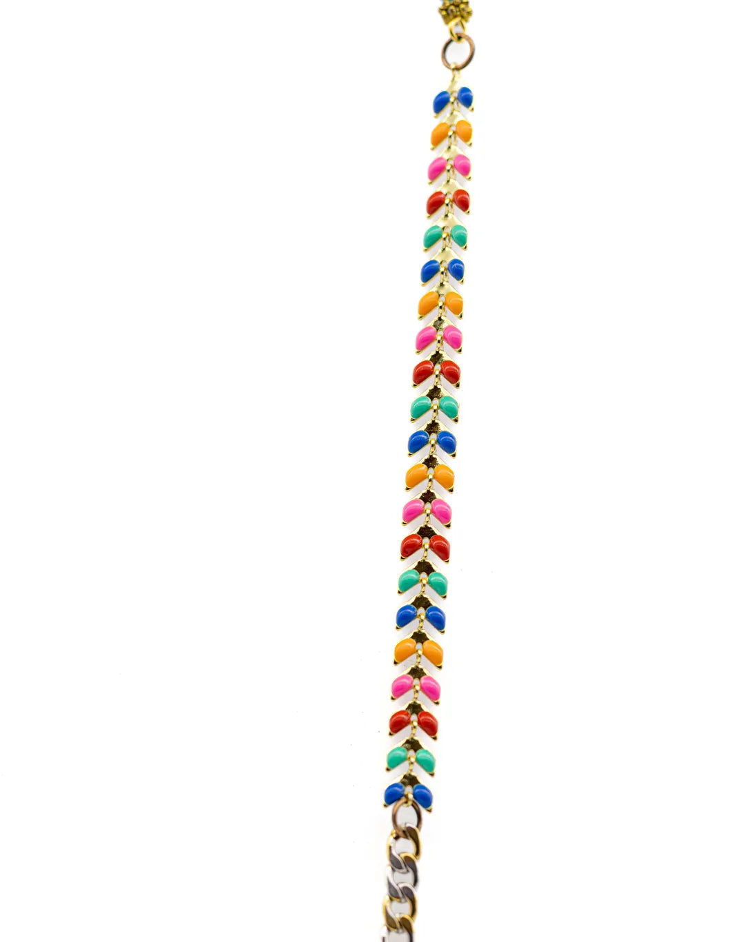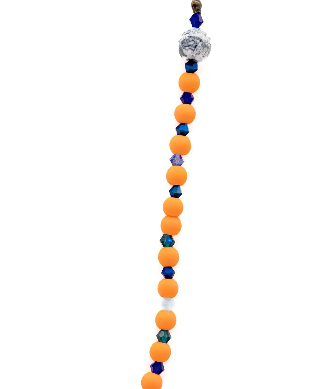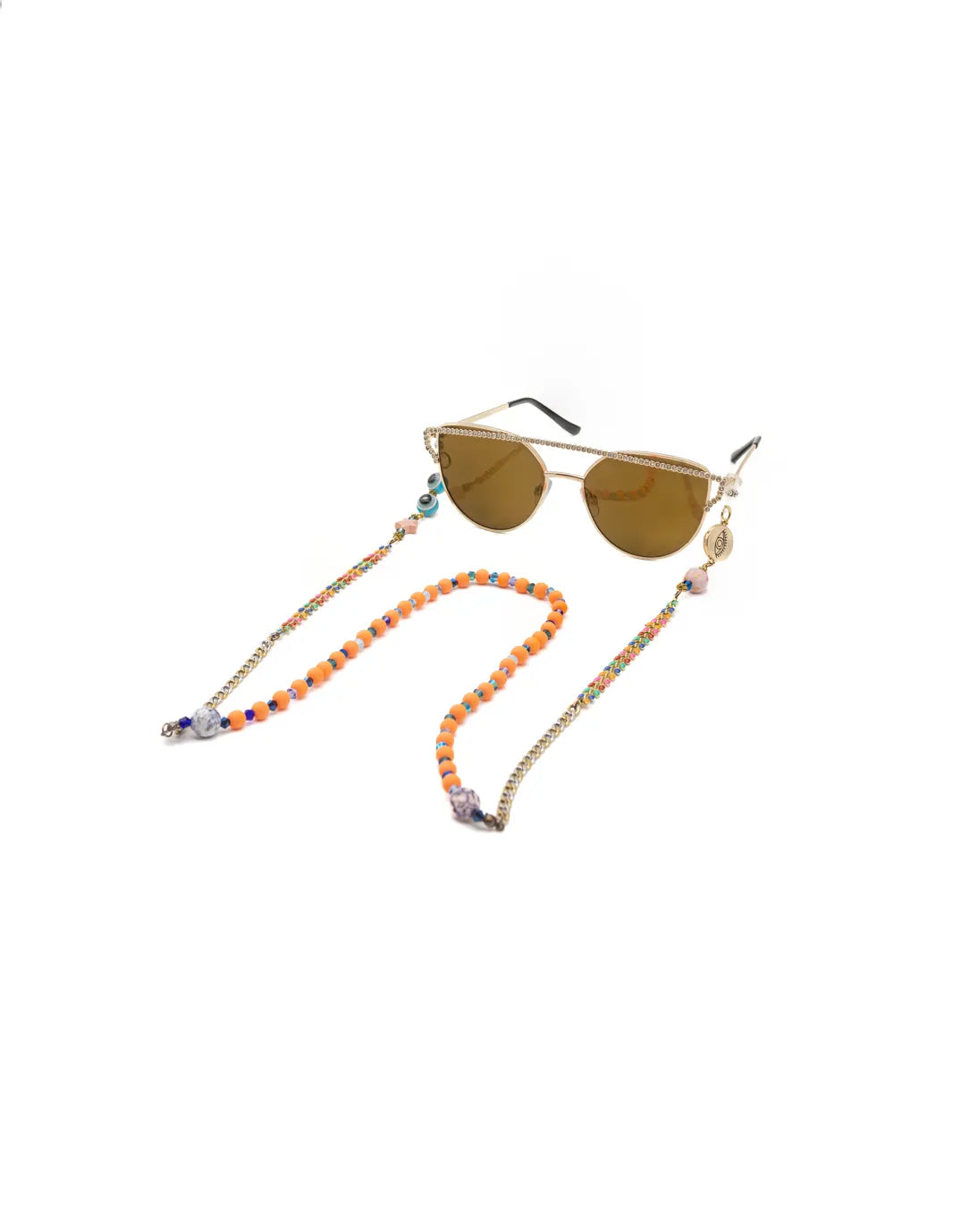 Get enchanted by the delicate blend of colors. The matte orange pearls intricately placed in the center adds a touch of whimsy and vibrance. The colored stainless steel chain perfectly complements the pearls, creating a dazzling display of color and elegance. The result is an eyewear chain that doesn't merely serve a functional purpose but becomes a captivating piece of your ensemble, enhancing your appeal.