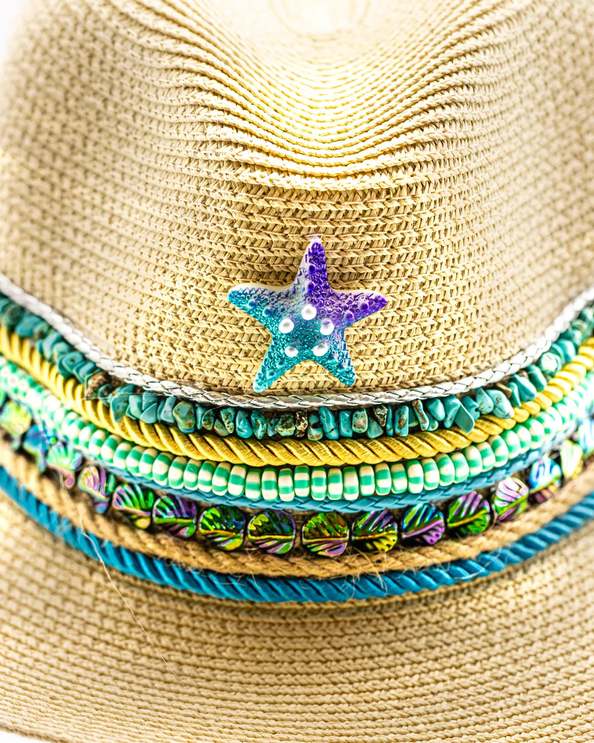 Taking center stage on this beautiful accessory is a dazzling blue sea star, beautifully nestling on the middle front of the hat. This aqua embellishment adds a splash of marine charm and gives the hat an aquatic feeling. Each bead and sea star is meticulously crafted and arranged, presenting a story of the deep blue sea every time you wear it. It's more than an accessory; it's your personal piece of the ocean.